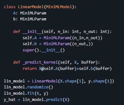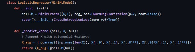 The model can then be initialised, randomised (this also creates the parameter buffer for the first time), and fit to data with a simple function call. You’ll notice here that no loss function was specified, which means the default was used (root mean square error). Different loss functions, including custom ones created by the user, can be passed to the parent constructor of a MiniMLModel. In addition the fit method takes in a regularisation lambda parameter to adjust the strength of regularisation, which is computed on each parameter using the function passed to them on creation. Here is for example an implementation of a custom logistic regression model for a specific problem with some extra polynomial features that makes use of these other functionality: